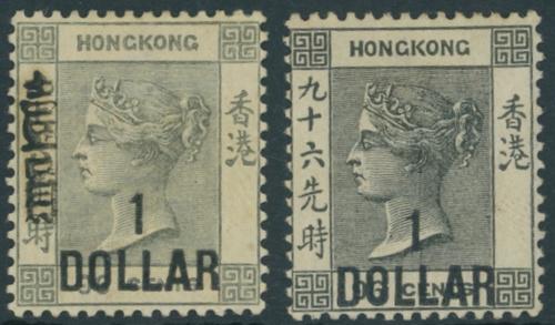 Hong Kong. 1898 (1 Apr.) CA $1 on 96c. grey-black and $1 on 96c. grey-black without Chinese characters; large part original gum. S.G. 52a, 53a, £2,975 (Image1)