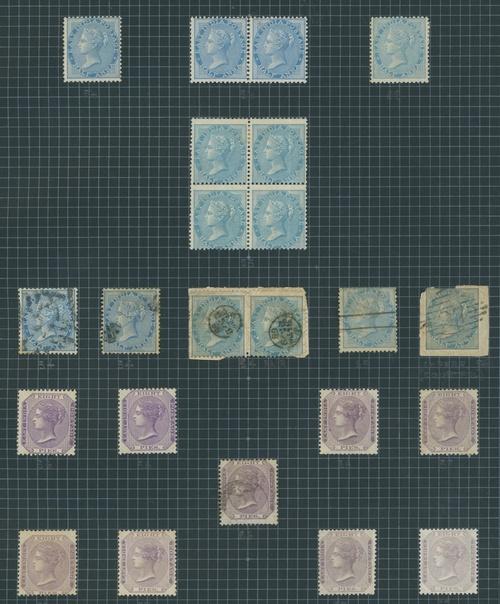 India. 1865-1900 mint and used collection on album pages including 1865 ½a. mint (8, including a pair and a block of four), 8pi. irregular block of seven with part sheet margins, 1a. mint (5), a few covers, 2a. mint (3), 4a. mint (2), 1866 Fiscal 6a. purple (4, all used), 8a. mint (2), later issues to 1882 and 1895 High Values 2r, 3r. and 53. (3 of each used), etc., also a range of other used; a useful group (Image1)
