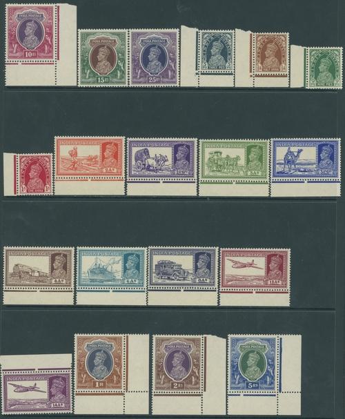 India. 1937-40 set of nineteen to 25r., unmounted mint; most values marginal including 1r., 2r., 5r. and 10r. corner marginal, fine and very fresh. S.G. 247-264 (Image1)