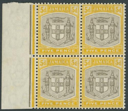 Jamaica. 1905-11 MCA 5d. grey and orange-yellow, block of four from the left of the sheet, variety 'ser.et' for 'serviet' at upper right; mounted in the margin only, fine and rare, a handsome positional multiple. S.G. 43a, £1,400 (Image1)