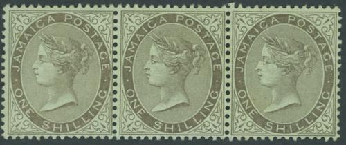 Jamaica. 1905-11 MCA 1/- black on green, horizontal strip of three the central stamp showing variety '$' for 's', large part original gum; very fine. S.G. 54a, £950+ (Image1)