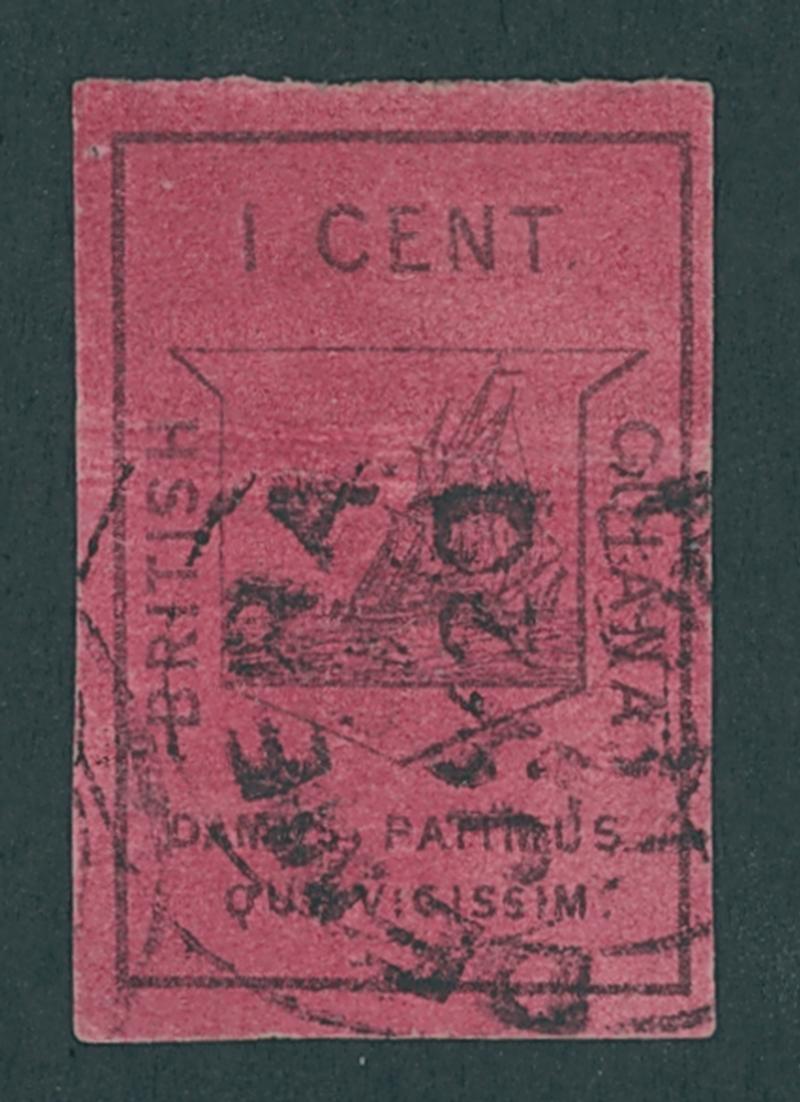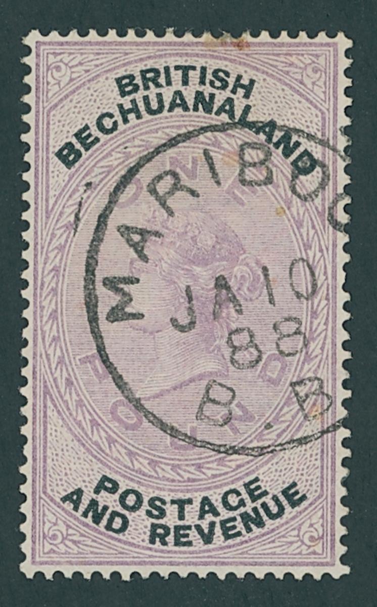 Bechuanaland. British Bechuanaland. 1888 £1 lilac and black, used with crisp strike of 'maribogo/ ja 10/ 88/ b.b.', very early usage, a couple of small stains at top otherwise fine. Brandon Certificate (1980). S.G. 20, £900 (Image1)