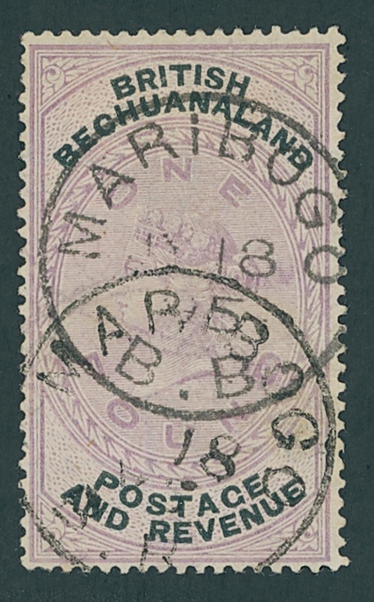 Bechuanaland. British Bechuanaland. 1888 £1 lilac and black, used with two strikes of 'maribogo/ b.b.' c.d.s., a good used example. Sismondo Certificate (2020). S.G. 20, £900 (Image1)