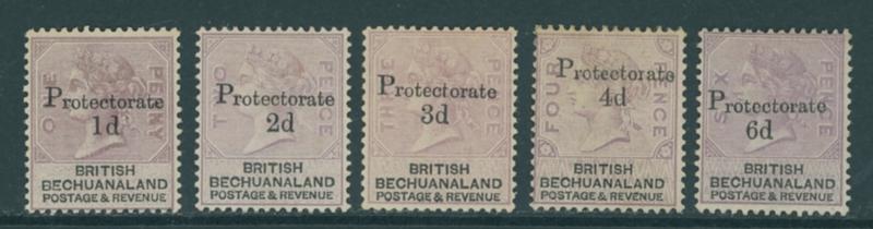 Bechuanaland. 1888 Protectorate surcharges group (5) comprising 1d. on 1d. lilac and black, 2d. on 2d. lilac and black, 3d. on 3d. lilac and black, 4d. on 4d. lilac and black and 6d. on 6d. lilac and black, mint (6d. unused without gum), good to fine. Sismondo Certificate (2008) for the 4d. S.G. 41-45, £890 (Image1)