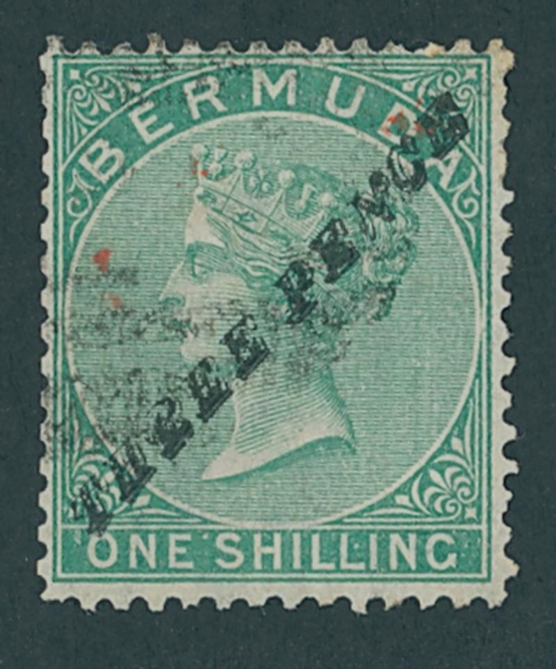Bermuda. 1874 3d. (Type 6) on 1/- green, used with indistinct cancellation; some light soiling otherwise fine. Sorani Certificate (1994). S.G. 13, £850 (Image1)