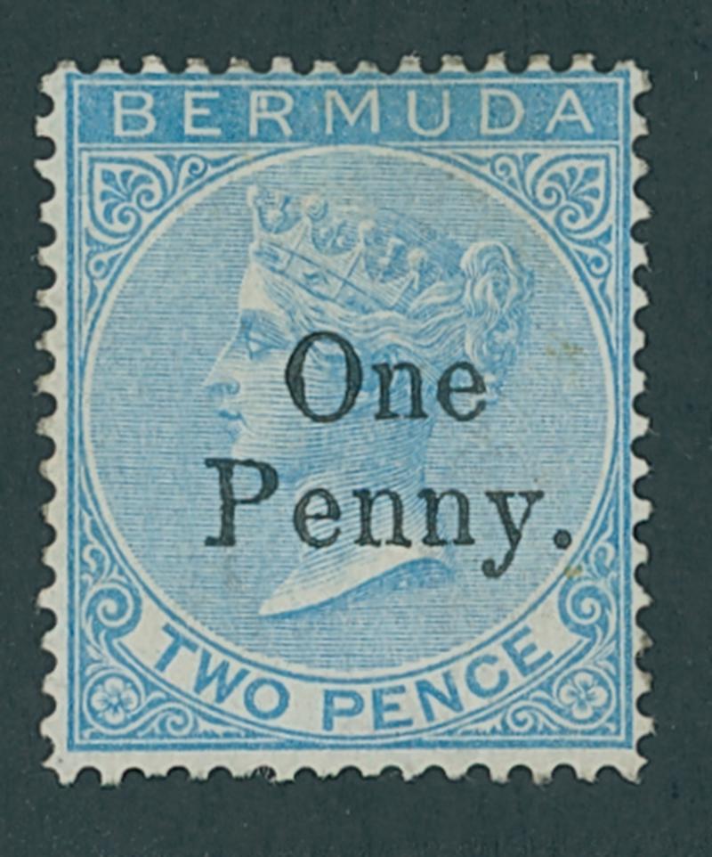 Bermuda. 1875 1d. on 2d. dull blue, part original gum, fine. R.P.S. Certificate (1951). S.G. 15, £700 (Image1)