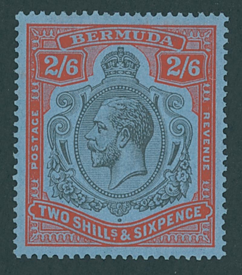 Bermuda. 1924-32 Watermark Multiple Script CA. 2/6d. black and scarlet-vermilion on deep blue, variety break through scroll, fine unmounted mint. S.G. 89jd, £550 (Image1)
