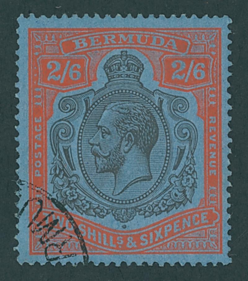 Bermuda. 1924-32 Watermark Multiple Script CA. 1932 2/6d. black and bright orange-vermilion on deep blue paper, used with small part cancellation; fine and rare. R.P.S. Certificate (2002) (when this was 89g). S.G. 89k, £3,000 (Image1)
