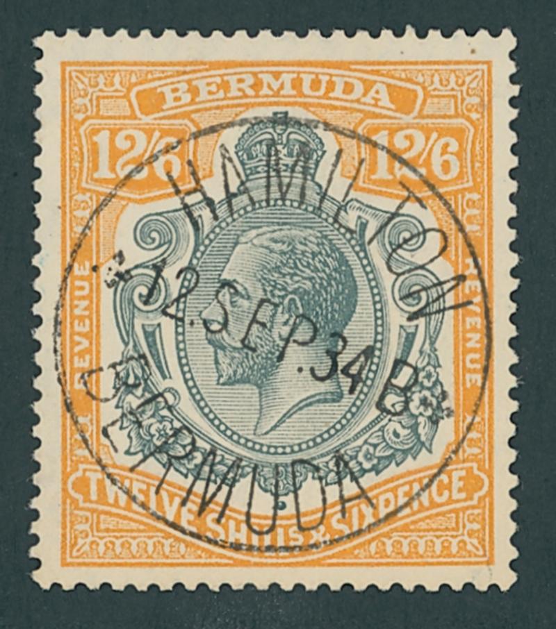 Bermuda. 1924-32 Watermark Multiple Script CA. 12/6d. grey and orange, used with complete crisp 'hamilton/ bermuda' c.d.s., fine. S.G. 93, £400 (Image1)