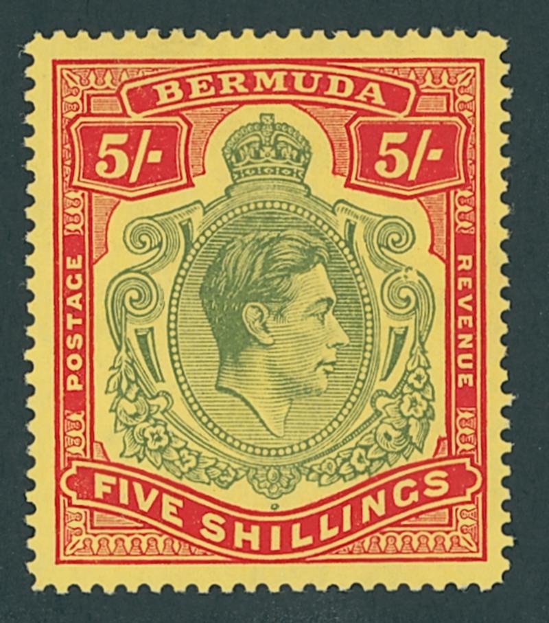 Bermuda. 1938-53 Watermark Multiple Script CA. 5/- dull yellow-green and red on yellow, variety broken lower right scroll, lightly mounted with usual streaky gum; fine. S.G. 118be, £1,300 (Image1)