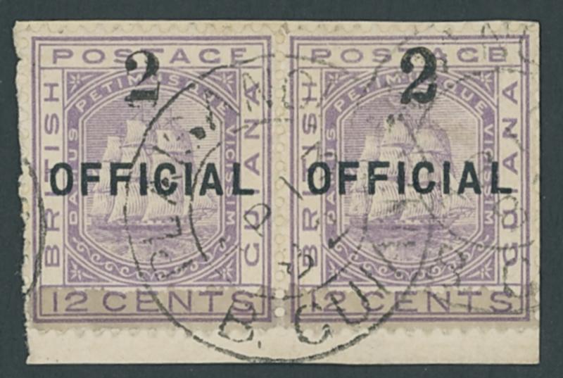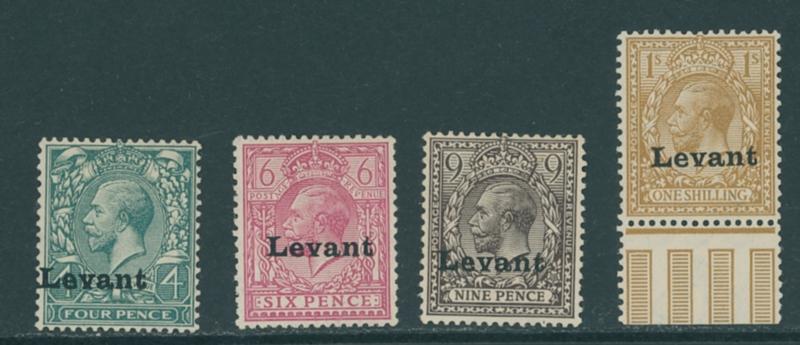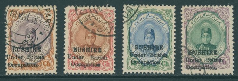 Bushire. 1915 (Aug.) a used group (6) comprising 2ch. sepia and carmine, 6ch. brown-lake and green, 9ch. indigo-lilac and brown , 10c. brown and carmine with variety no stop, 12ch. blue and green and 24ch. green and purple, variety damaged 'bu'; all fine used, 2ch. and 6ch. tied to small pieces. S.G. 2, 5, 6, 7a, 8 and 9 var., £1,090 (Image1)