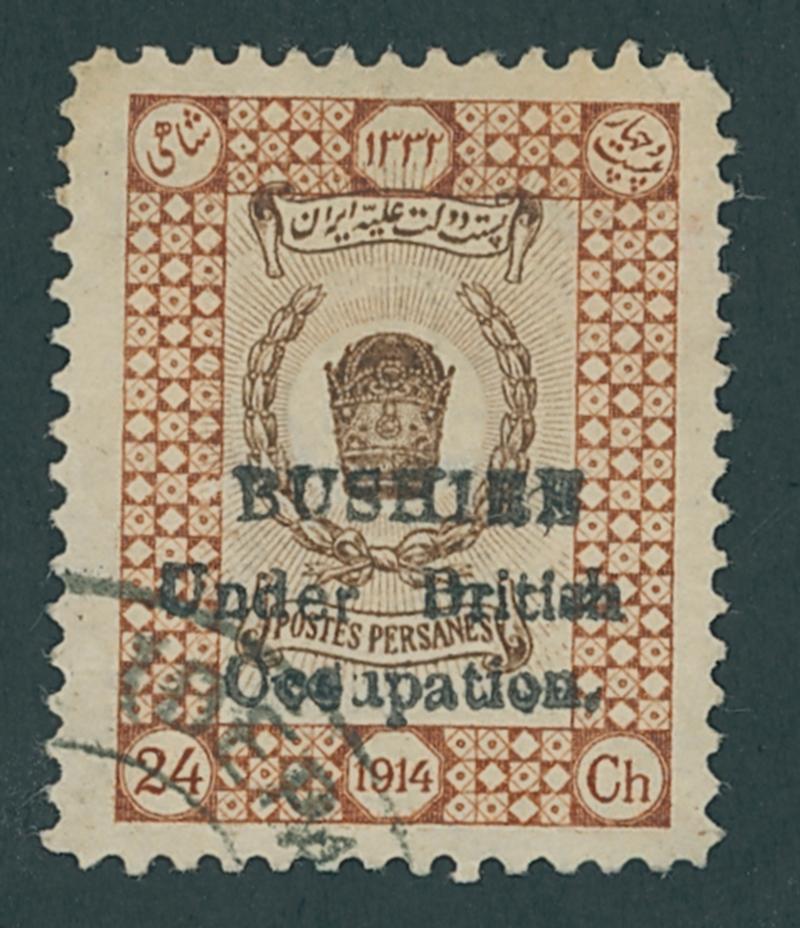 Bushire. 1915 (11 Sept.). 24ch. sepia and brown, used with part 'bouchir' c.d.s., fine and scarce. B.P.A. Certificate (2007). S.G. 23, £1,500 (Image1)