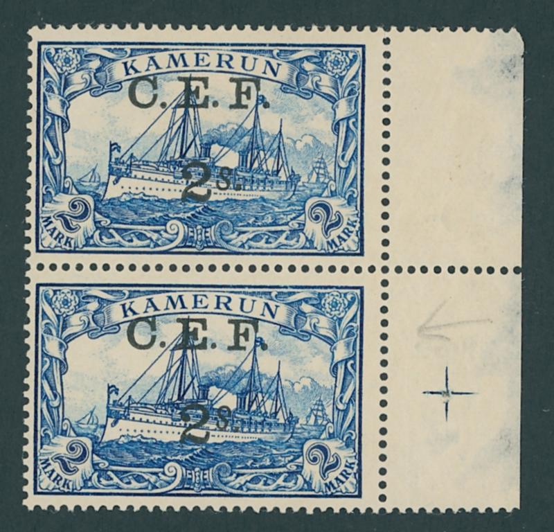 Cameroon. 1915 2/- on 2m. blue, vertical pair from the right of the sheet [6-12], [12] showing variety inverted 's', large part original gum; fine. Scheller Certificate (2024). S.G. B11, 11a, £1,225 (Image1)