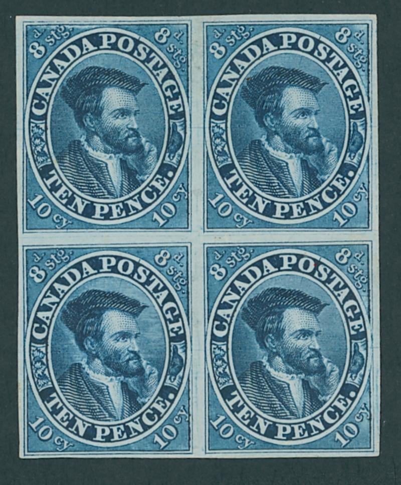 Canada. 1854 10d. blue 'Jacques Cartier', imperforate plate proof on India paper, a block of four without gum as produced; fine. Unitrade 7P (Image1)