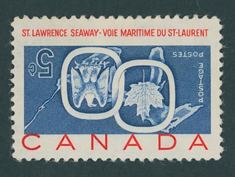 Canada. 1959 (June) Opening of St. Lawrence Seaway 5c. ultramarine and red, variety centre inverted, superb unmounted mint; very fine and rare. Philatelic Foundation (2002) and PSE (graded XF-Sup 95) (2013) Certificates. S.G. 513a, £10,000 (Image1)