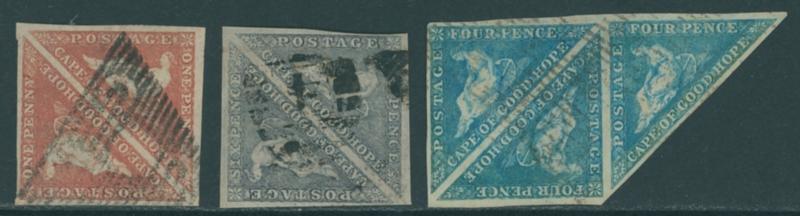 Cape of Good Hope. 1853-64 small used group of three multiples comprising 1853 Perkins Bacon 1d. brick-red on slightly blue paper and 6d. slate-lilac on blued paper, each in a pair and 1863-64 DLR 4d. blue irregular block of three; good to fine used (Image1)