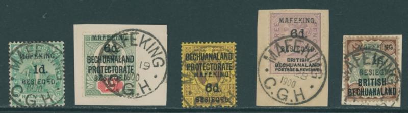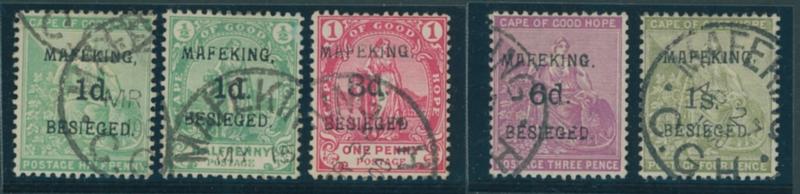 Cape of Good Hope. Mafeking Siege. 1900 used 'Serif' group (5) comprising 1d. on ½d. green (both), 3d. on 1d. carmine, 6d. on 3d. magenta (BPA Cert.) and 1/- on 4d. sage green, all used with part clear 'mafeking/ c.g.h.' c.d.s., good to fine. S.G. 1-5, £1,190 (Image1)