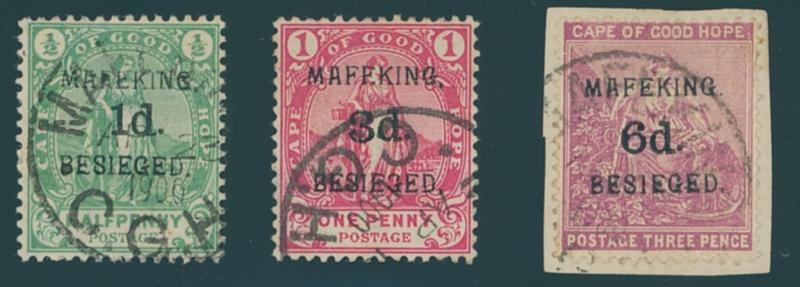 Cape of Good Hope. Mafeking Siege. 1900 1d. on ½d. green, 3d. on 1d. carmine and 6d. on 3d. magenta, all used with part 'mafeking/ c.g.h.'; Sismondo Certificates (2021). S.G. 2-4, £600+ . (Image1)