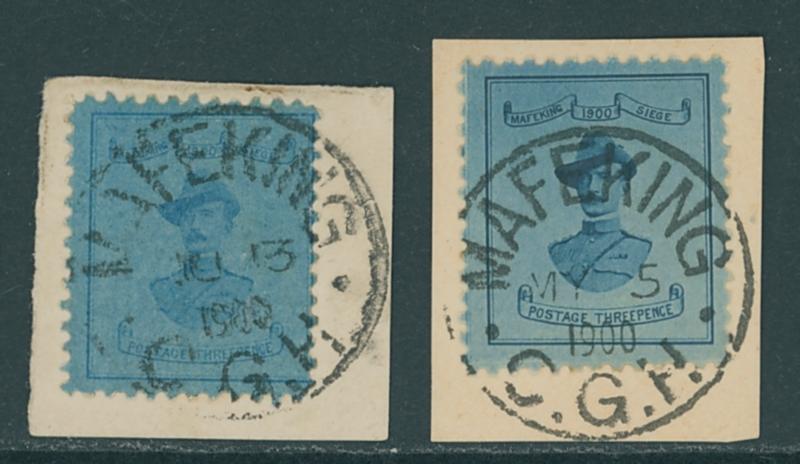 Cape of Good Hope. Mafeking Siege. 1900 (6-10 Apr.) 3d. deep blue on blue, two used examples (2) both tied to small pieces by 'mafeking/ c.g.h.' cancellations. Sismondo Certificate (2021) for each. S.G. 19, £1,100 (Image1)