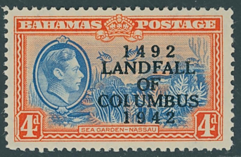 Bahamas. 1942 Landfall of Columbus 4d. light-blue and red-orange, variety 'coiumbus', very lightly mounted mint; fine. S.G. 168a, £1,000 (Image1)