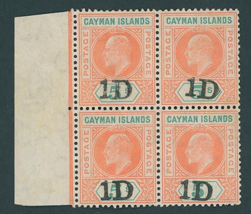 Cayman Islands. 1907 (Nov.) 1d. on 5/- salmon and green, a block of four from the left of the sheet; large part original gum; fine. R.P.S. Certificate (1972) S.G. 19, £1,100+ (Image1)