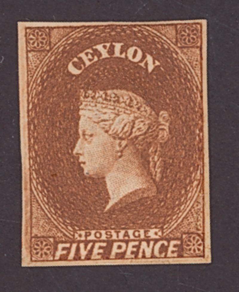 Ceylon. 1857-59 Watermark Star. 5d. chestnut, four good even margins, part original gum; fine. S.G. 5, £1,600 (Image1)
