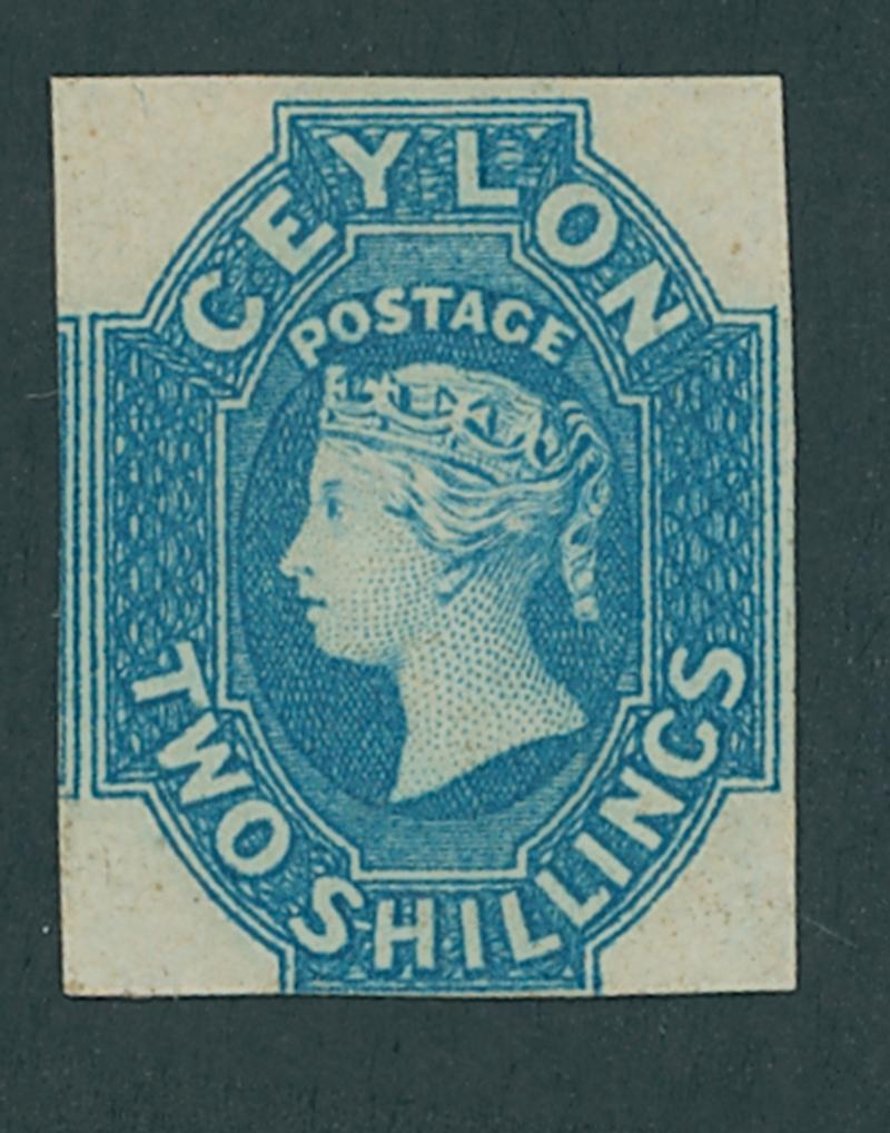 Ceylon. 1857-59 Watermark Star. 2/- dull blue, an unused example without gum, clear margins on three sides and just touching the design at lower left, fine appearance. S.G. 12, £6,500 (Image1)