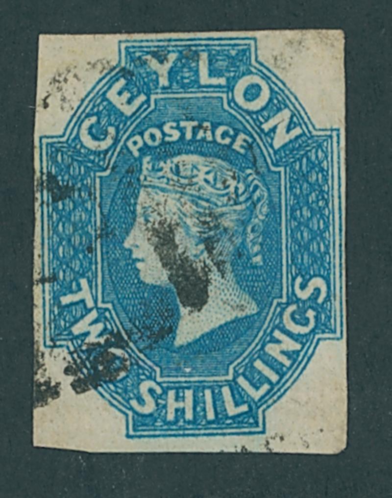 Ceylon. 1857-59 Watermark Star. 2/- dull blue, good to large margins, a used example with slightly smudged cancellation; a good example. R.P.S. Certificate (1970). S.G. 12, £1,400 (Image1)