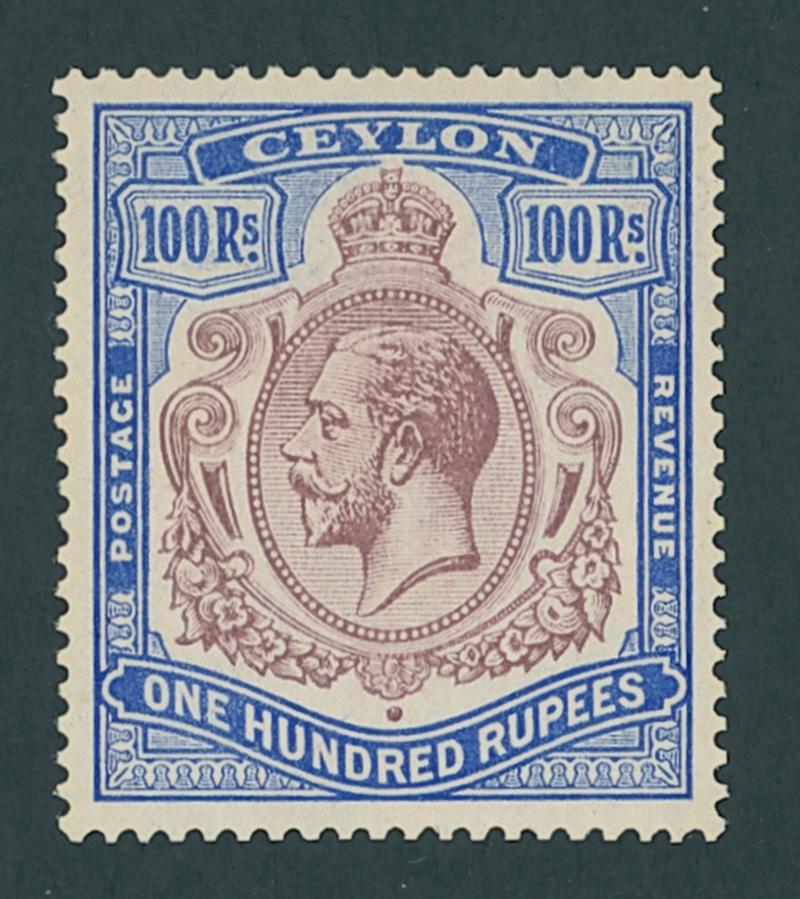 Ceylon. 1921-32 Script 100r. dull purple and blue, large part original gum; fine. S.G. 360, £2,750 (Image1)