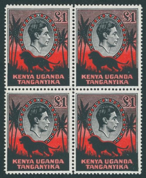 Collections and Ranges. An unusual King George VI British Commonwealth collection in album, comprising mint sets in blocks of four, all seemingly unmounted, including British Honduras 1938-47 set, British Virgin Islands 1938-47 set, Cyprus 1938-51 set, Hong Kong 1938-52 values to $10 lilac and blue, Jamaica 1938-52 set, 1938-54 K.U.T. set (£1 perf. 14), Kuwait 1948-49 set, Leeward Islands 1938-51 set with 10/- plate number "1", Malaya B.M.A. 1945-48 values to $5 purple and orange, Mauritius 1938-49 set, Montserrat 1938-48 set to 5/-, North Borneo 1947 set, 1950-52 values to $10 (less S.G. 366), Northern Rhodesia 1938-52 set, Nyasaland 1945 set, Pakistan 1947 set, Southern Rhodesia 1938 set, St. Helena 1938-44 set, St. Lucia 1938-48 set, St. Vincent 1938-47 set, Seychelles 1938-49 values to 5r., Swaziland 1938-54 set, Transjordan 1930-39 set, Trinidad and Tobago 1938-44 set, Tristan da Cunha 1952 overprinted set, Turks and Caicos 1938-45 set, 1952 imprint set, Zanzibar 1936 set. An excellent lot with plenty of potential, £17,000+ Photo. (Image1)