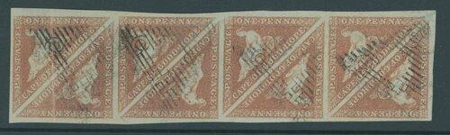 Cape of Good Hope 1853 (1 Sept.) Paper Slightly Blued 1d. brick-red, a block of four with clear to very large margins and a portion... (Image1)