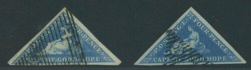 Cape of Good Hope 1853 (1 Sept.) Paper Deeply Blued 4d. deep blue, two used examples, both with large even margins and neat triangul... (Image1)