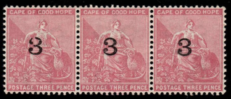 CAPE of GOOD HOPE 1880 Provisional 3 on 3d pale rose horizontal strip of 3, very fine mint, particularly fresh for these. SG 37. Cat .£450(Image 1) (Image)