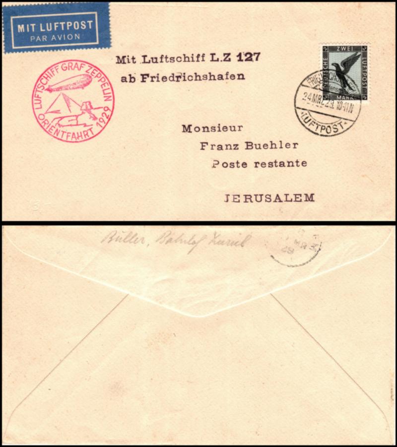 Palestine 1929 Orient Flight Drop Mail – A 1929 cover from the Orient Flight, sent from Friedrichshafen, franked with a 2M Eagle stamp and cancelled on 24 March. Addressed to Jerusalem, the cover features a red Orient Flight cachet on the front, with a March arrival marking on the back flap. Si.23c (Image)