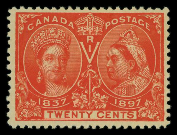 1897, Queen Victoria Jubilee, 20¢ vermilion (Scott 59), o.g., hinged, Fine to Very Fine. Scott $300. (Image)