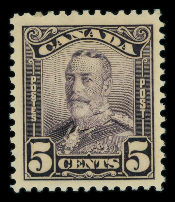 1928, King George V "Scroll", 5¢ deep violet (Scott 153), o.g., never hinged, Very Fine. Scott $30. (Image)