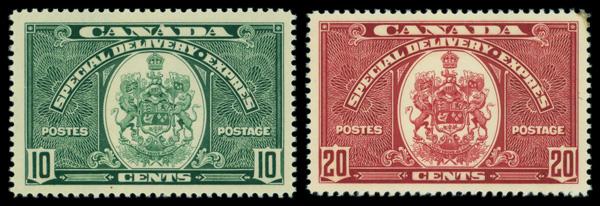 Special Delivery, 1938-39, 10¢ dark green & 20¢ dark carmine (Scott E7-E8), set of 2, o.g., lightly hinged, Very Fine. Scott $42. (Image)