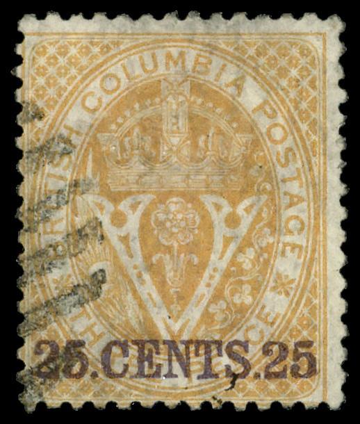 1869, Seal of the Colony, 25¢ on 3d orange, perf. 14 (Scott 11), Fine to Very Fine. Scott $325. (Image)