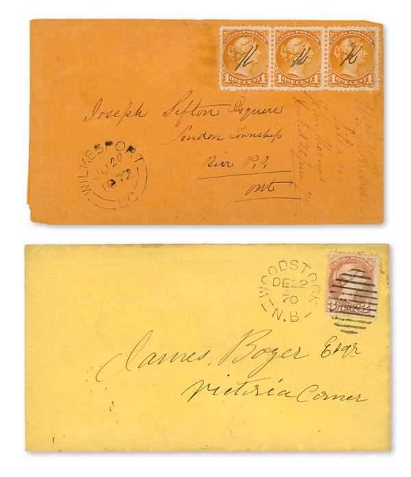 1870-72, Small Queen, 1¢ yellow//6¢ yellow brown, on-cover compilation (Scott 35//39), binder with neat selection of 48 covers, most solo uses but includes multiple and mixed frankings, sent both within Canada and across the border to the US; comprises 1¢ (2 covers), 2¢ (2), 2¢+1¢, 2¢+3¢, 3¢ (41) and 6¢ (with 2¢ Registry stamp); nice mix of shades and cancels, some covers with knowledgeable write-up accompanying; note also War Tax Revenue used to pay postcard postage; appealing group, with condition varying as to be expected, Fine to Very Fine, fully imaged online. Shipping charges apply - weight 2.2 lbs. Scott $487+. (PDF for this Lot) (Image)