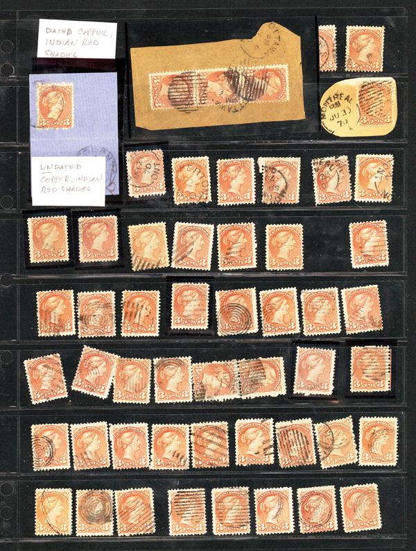 1873, Small Queen, 3¢ orange red, specialized holding (Scott 37), approximately 150 items arranged on stock pages, most off-piece but including strip of five, on-piece singles and strip of three, etc.; everything a specialist could want is here, including shades (with noted copper red and Indian red varieties), paper varieties, different printings and perforations, a wealth of cancels including fancies, dated uses, etc., etc., etc.; built by a knowledgeable collector, and includes two pages of his handwritten notes; a boon for the Small Queen enthusiast, generally Fine to Very Fine, fully imaged online. (PDF for this Lot) (Image)