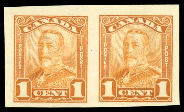 1928, King George V "Scroll", 1¢ orange, imperf (Scott 149b), pair, o.g., never hinged, Fine to Very Fine. Scott $125. (Image)