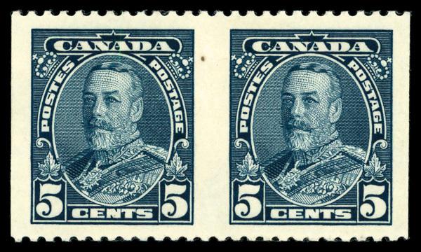 1935, King George V, 5¢ blue, imperf vertically (Scott 221a), horizontal pair, o.g., lightly hinged, Very Fine to Extremely Fine. Scott $200. (Image)