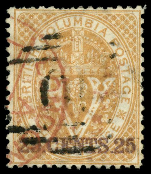 1869, Seal of the Colony, 25¢ on 3d orange, perf. 14 (Scott 11); short perfs at top, Very Fine. Scott $325. (Image)