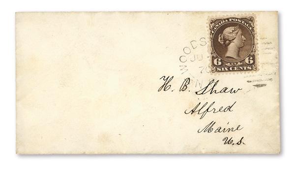 1868, Large Queen, 6¢ dark brown (Scott 27), lovely stamp with bold color and sound centering, tied on cover from Woodstock, N.B. to Alfred, Maine; stamp tied by Woodstock June [day unclear] 1870 barrel duplex; cover with crease at left well away from stamp, otherwise sound, Fine to Very Fine. Scott $250. (Image)