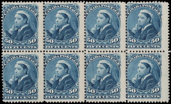 1893, Queen Victoria "Widow's Weeds", 50¢ deep blue (Scott 47), a fresh mint block of 8, o.g., the upper right stamp is never hinged (the three lower left stamps are too, but the gum is slightly disturbed - not counted as NH), Very Good. Scott $4,550 as singles. (Image)