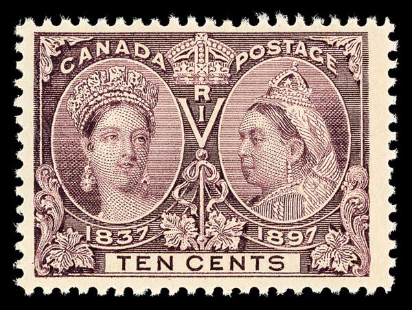 1897, Queen Victoria Jubilee, 10¢ brown violet (Scott 57), o.g., never hinged, fresh with strong color; vertical gum bend, otherwise Fine to Very Fine. Scott $400. (Image)