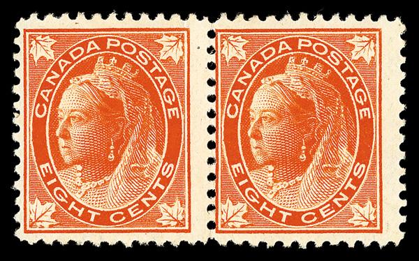 1897, Queen Victoria "Maple Leaf", 8¢ orange (Scott 72), horizontal pair, o.g., never hinged, Post Office fresh with glowing color on like-new paper, Fine. Scott $1,700 as singles. (Image)
