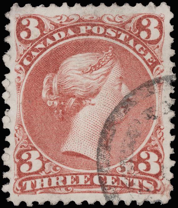1868, Large Queen, 3¢ red (Scott 25), fresh and perfectly centered with rich color and a neat corner cancel (a partial 2-ring numeral), Extremely Fine to Superb. A beauty! Unitrade C$50 ($40). Scott $35. (Image)
