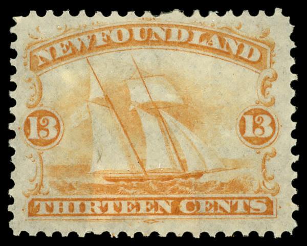 1865, 13¢ orange on yellowish (Scott 30), o.g., hinge remnants, Fine to Very Fine. Scott $250. (Image)