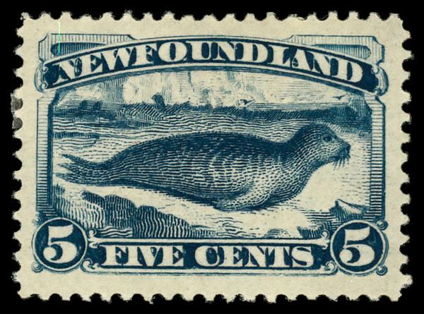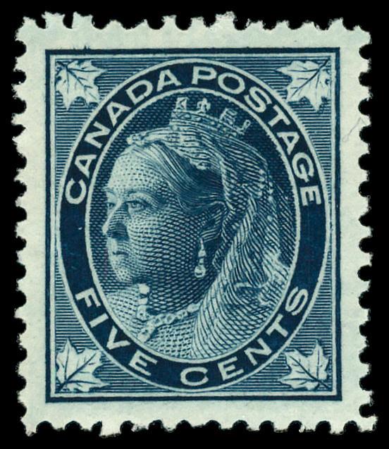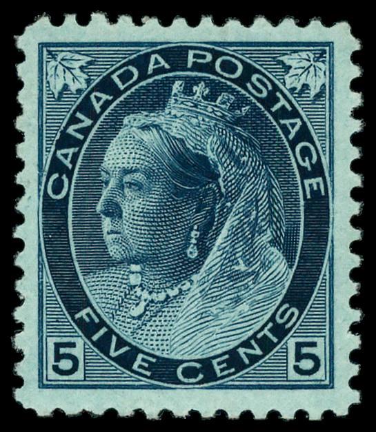 1897, Queen Victoria "Maple Leaf", 5¢ dark blue, on bluish paper (Scott 70), o.g., small hinge remnant, Extremely Fine. Scott $175. (Image)